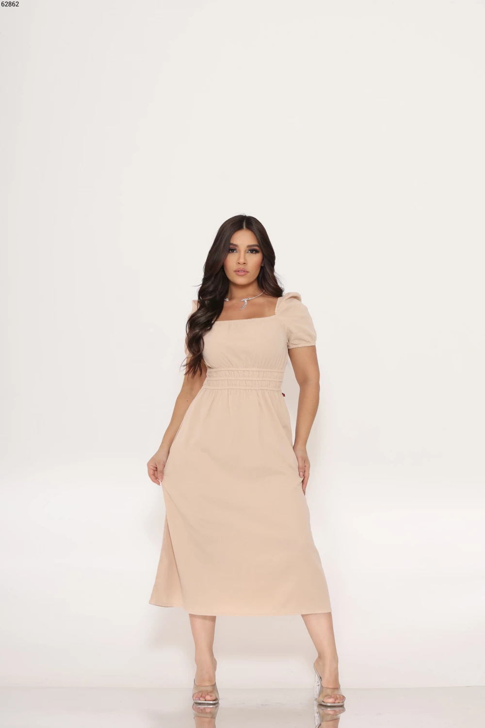 Ref.62878Vestido Feminino Regular Midi Manga Bufante