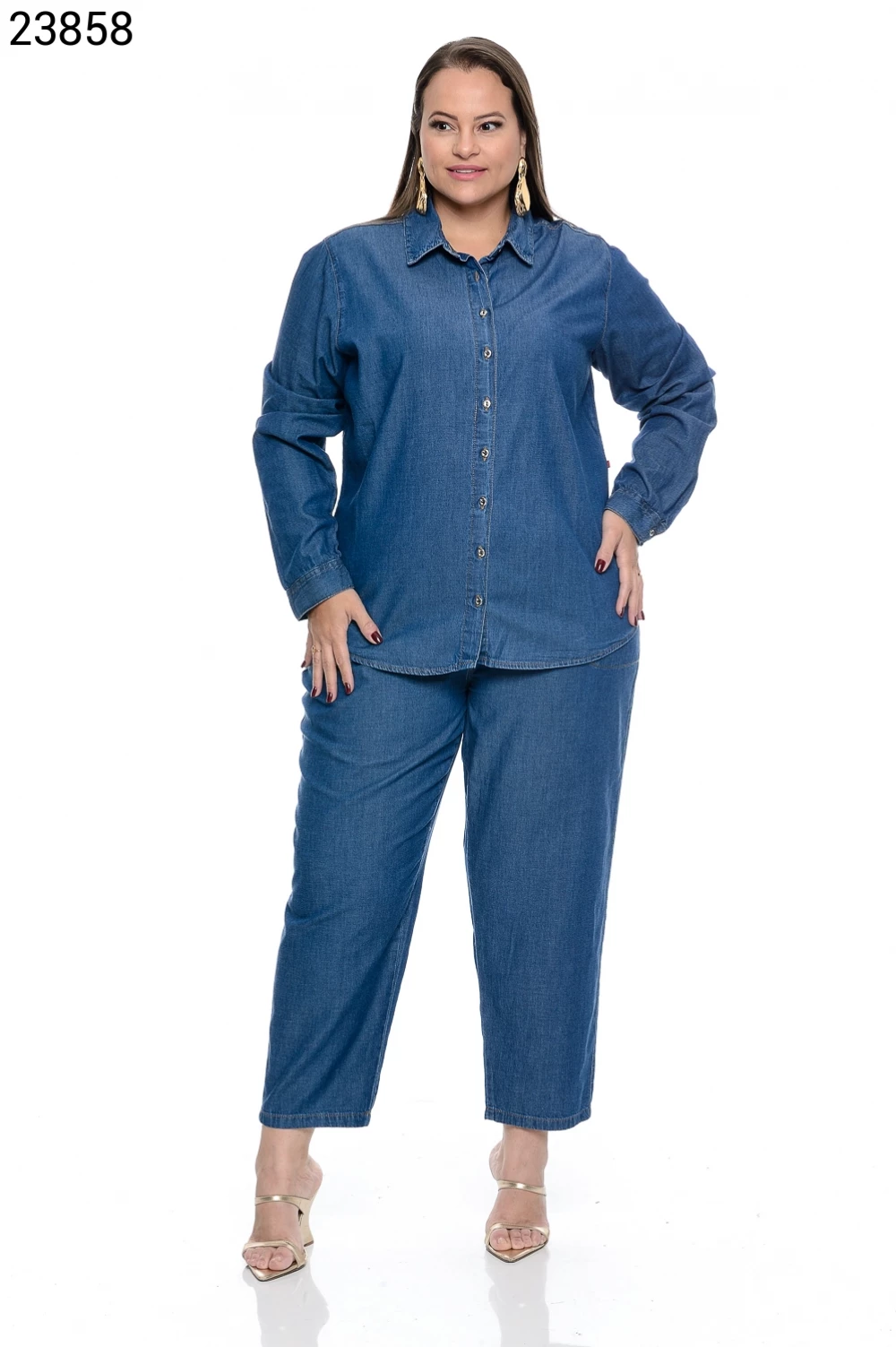 Camisa Feminina Plus Manga Longa com Franzidos e Jeans - 22211