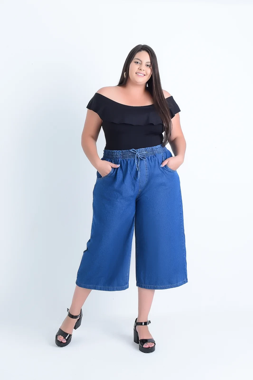 Calça Fem Plus Pantacourt com Elastico e Cordao no cos Jeans - 15186