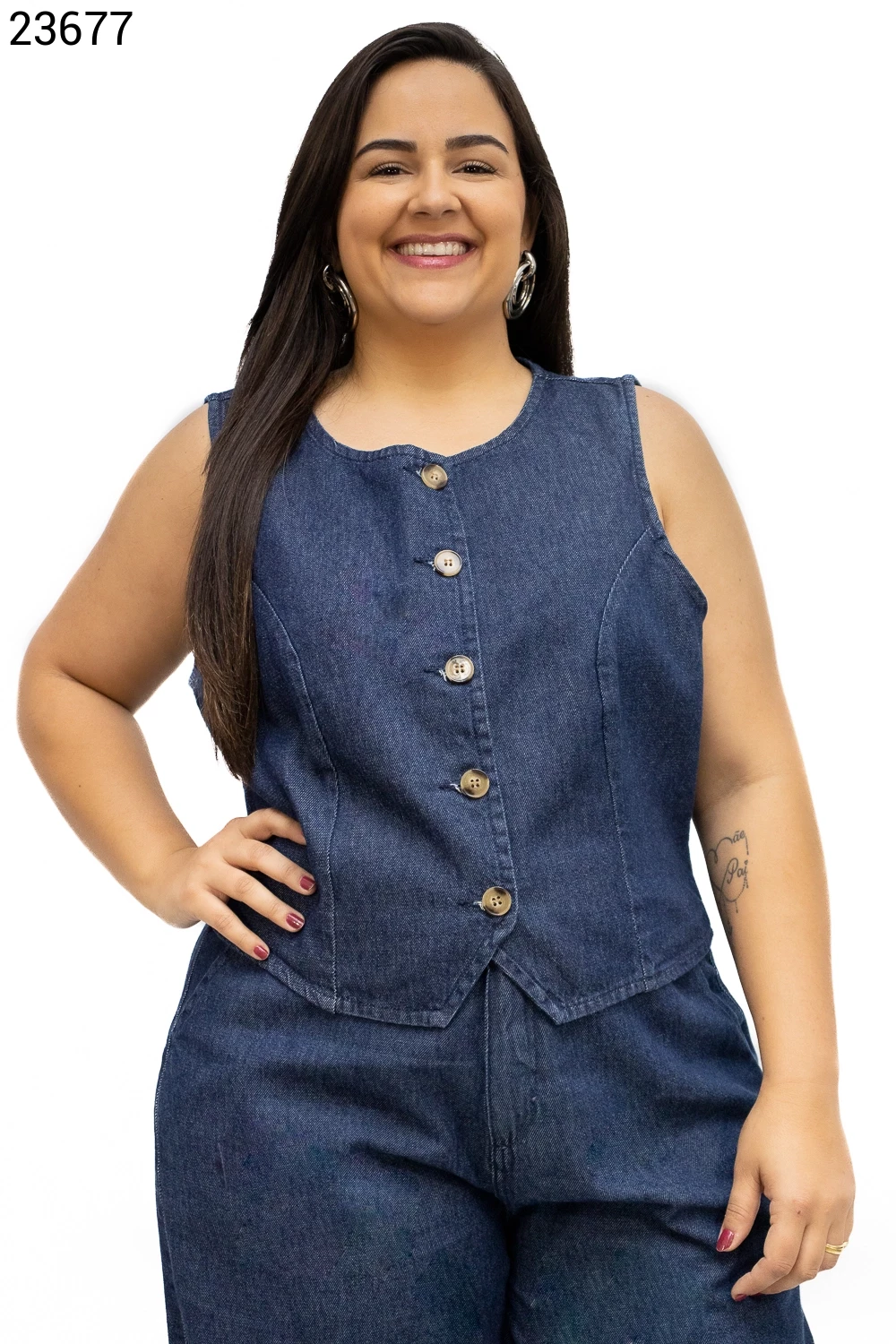 Colete Feminino Plus Size Jeans com Decote Canoa